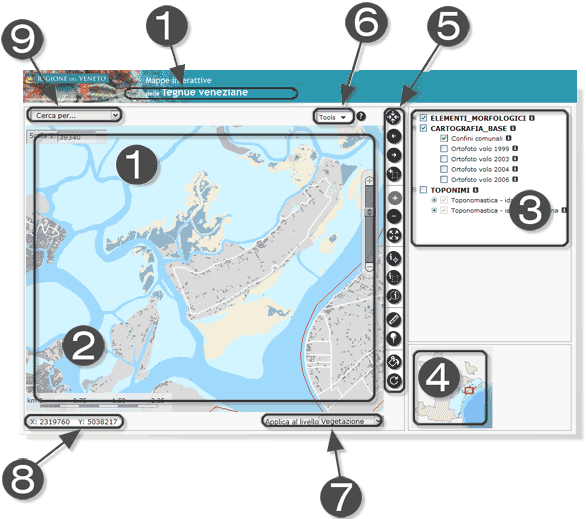 Qui sotto è riprodotta la pagina con il webGIS che permette la visualizzazione delle mappe. Clicca sui diversi punti dell'immagine per imparare a visualizzare le mappe e tutte le informazioni che contengono.