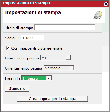 - creare una mappa in formato pdf: selezionando la voce 'Stampa mappa' si aprirà la seguente finestra che permetterà di creare di una mappa con legenda in modalità standard o avanzata: